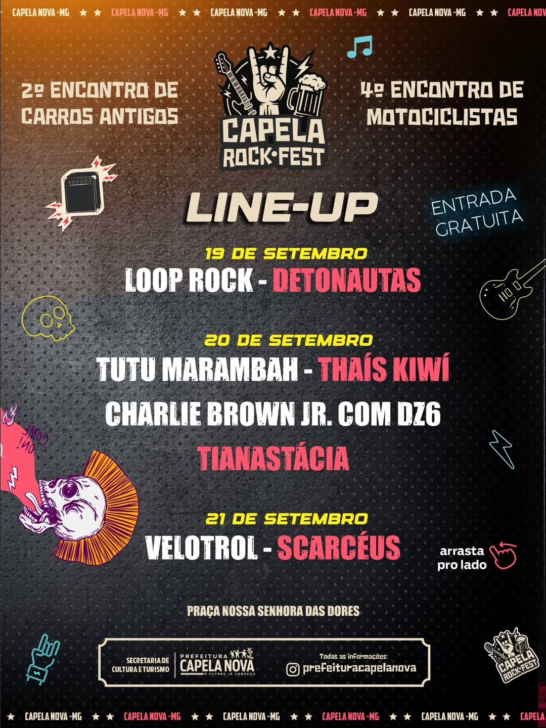 👉 O festival reúne música, cultura e paixão pelo rock com o 2º Encontro de Carros Antigos e o 4º Encontro de Motociclistas.