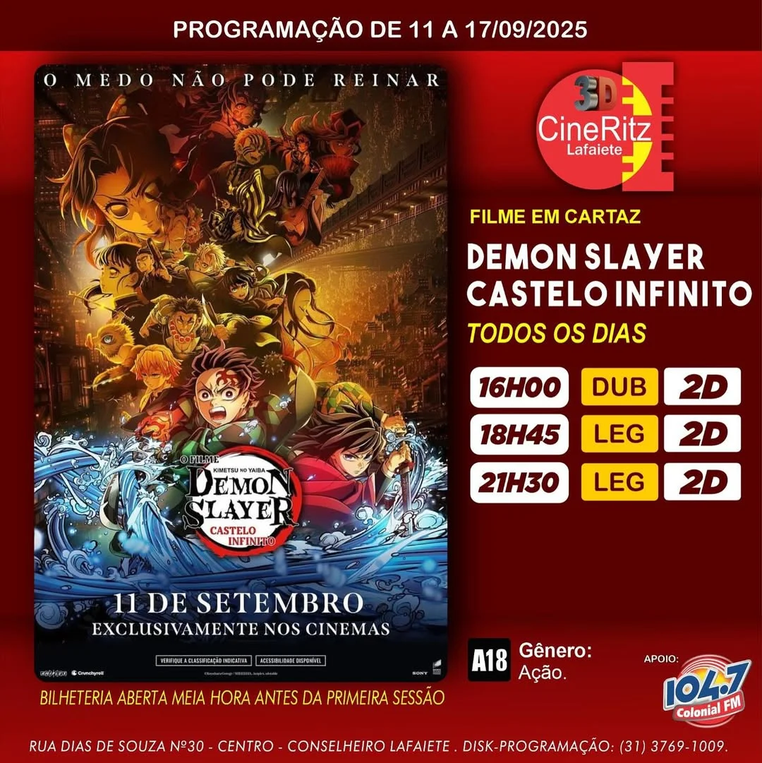 Prepare-se para a emoção! O aguardado filme Demon Slayer: Castelo Infinito já está em cartaz no Cine Ritz Lafaiete.